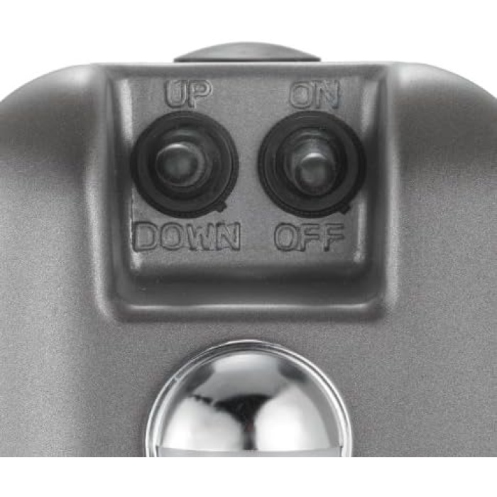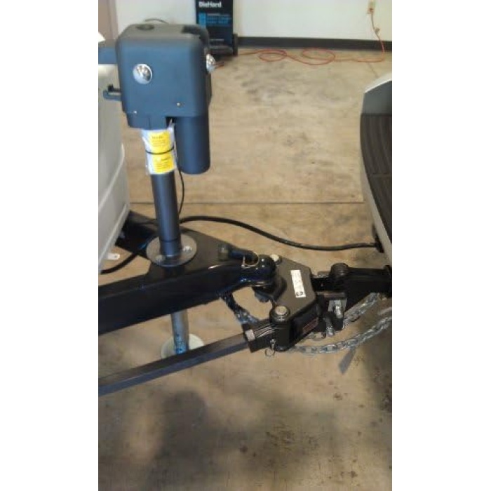 Powered trailer jack with 4,500 pound rating, 12-volt operation, hardened steel gears, and soldered connections
